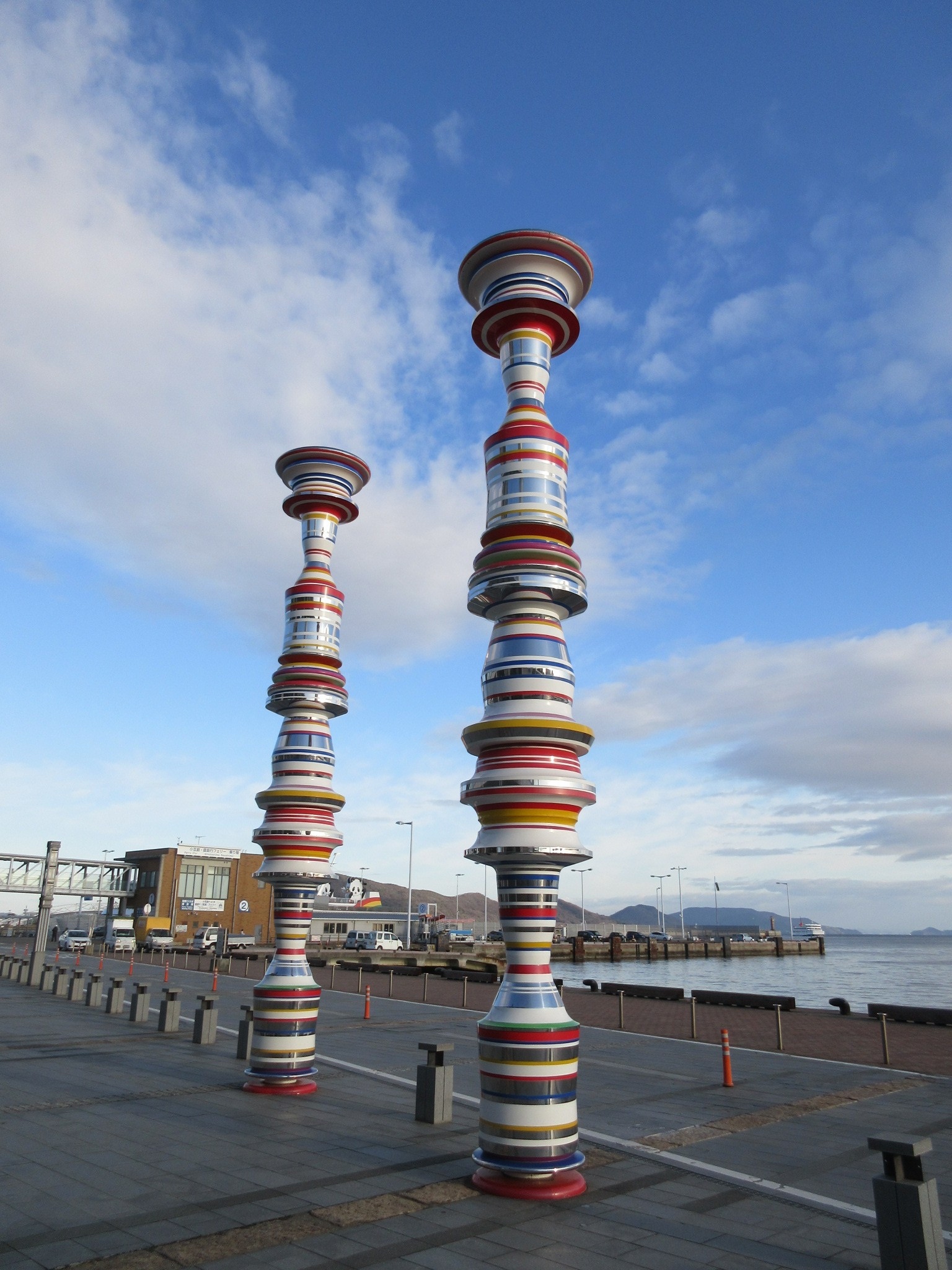 高松港の桟橋周辺を散策した際、港のシンボル的存在になっている【Liminal Air -core- 】を見学しました。天気も快晴で、上に向かって太さが不規則に変化した、2本のカラフルな塔はとても印象に残りました。見学する際には、JRの高松駅より琴電の高松築港駅からの方がアクセスしやすいと思います。