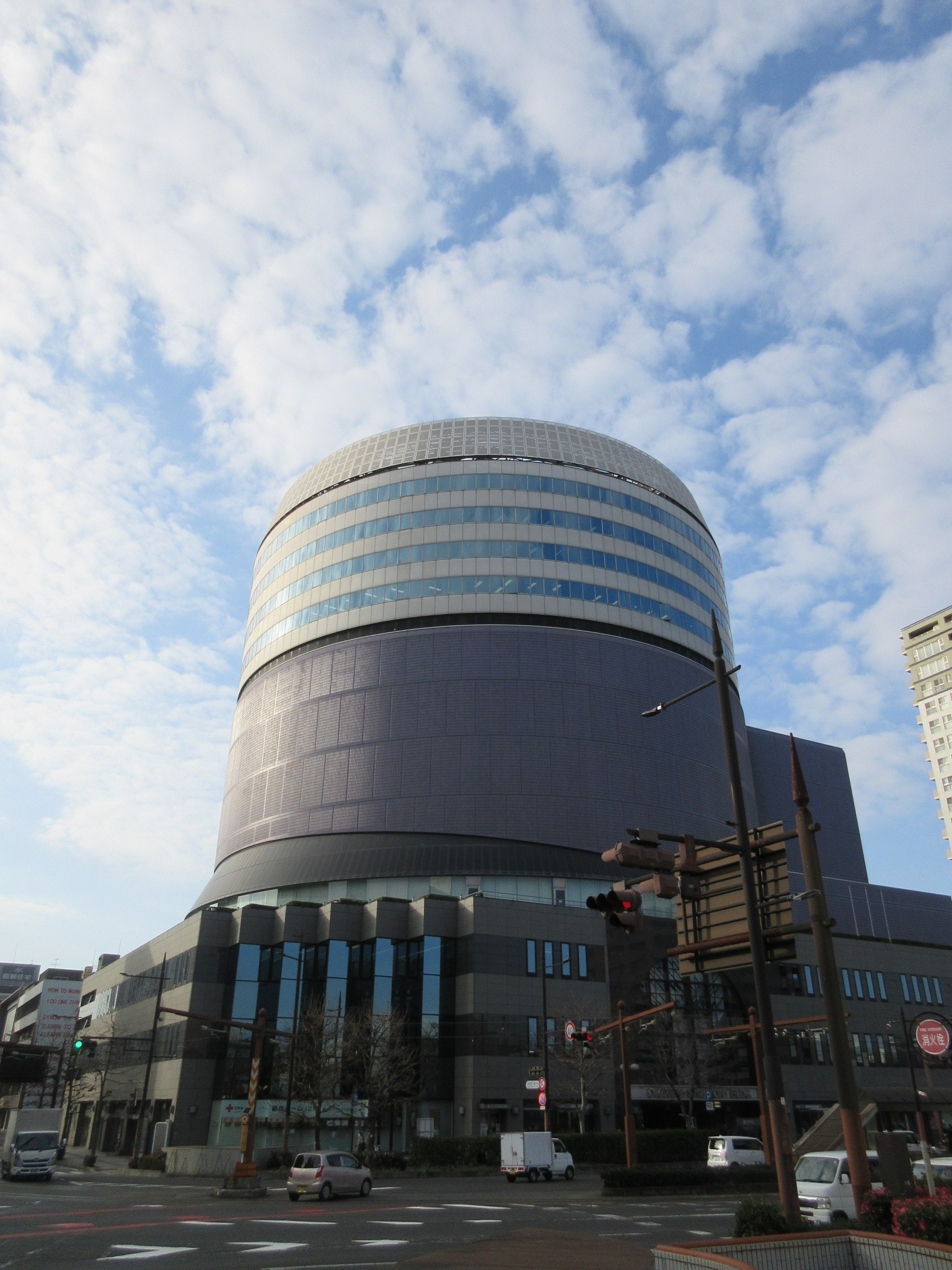 岡山滞在の際、桃太郎大通りを路面電車で城下電停まで乗車した場所、交差点に面して建つ円筒形のふとっちょのビルが【岡山シンフォニーホール】です。シンフォニーホールということで、低層の横に広い建て物を想像していたので、些かその形状に驚かされました。エントランスの案内などをチェックしますと、大ホール以外にも練習でも使えそうな施設や、一部はテナントも入居していることが分かりました。様々な音楽芸術活動の場ということで、この円筒形の形状にも納得がいきました。
