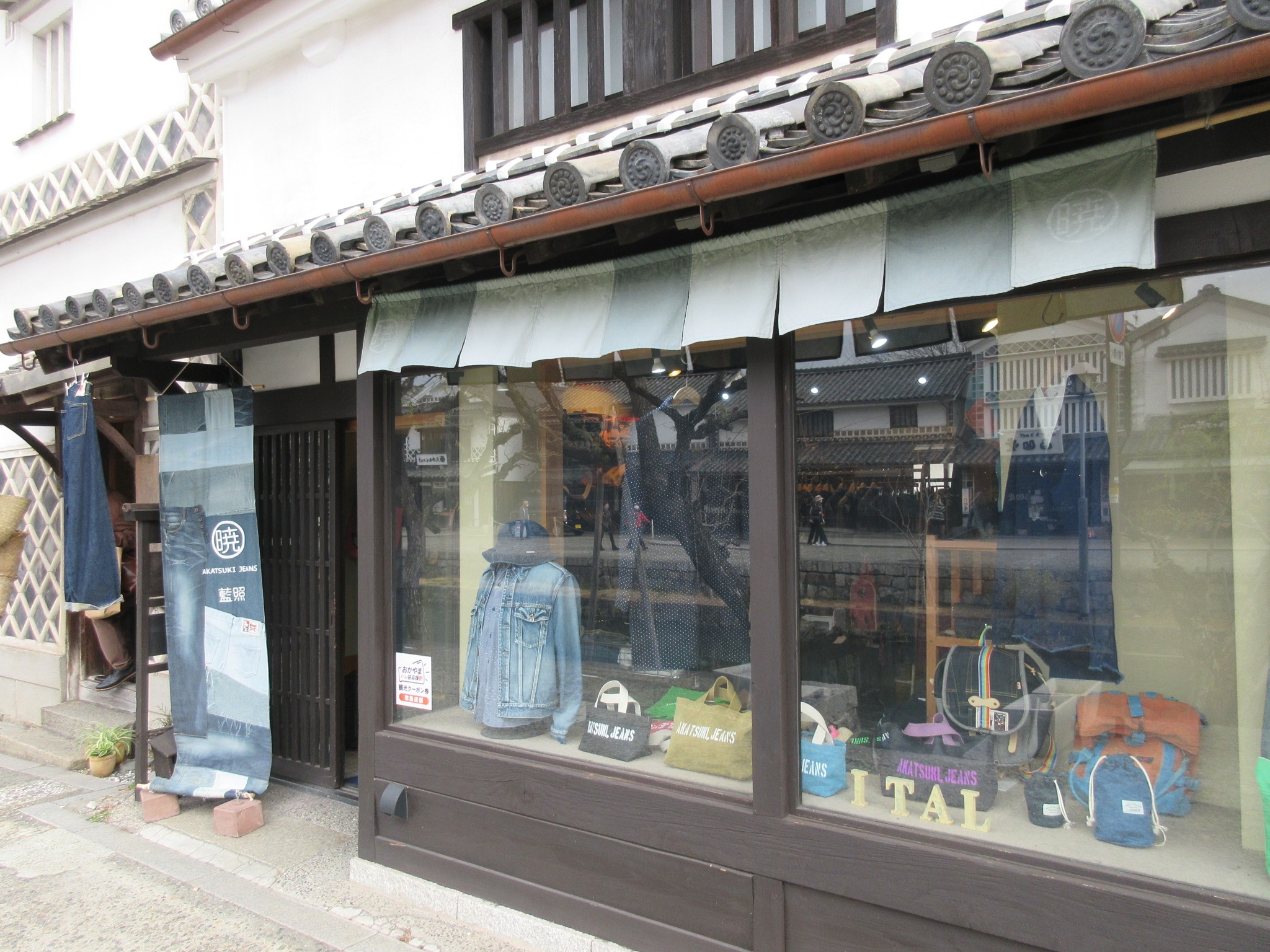 倉敷美観地区の倉敷川沿い東側にあるデニム専門店で、高砂橋に近い場所でした。倉敷デニムを使ったブランド「暁JEANS」などが販売されており、デニムのジャケットやトートバッグなどがキレイにディスプレイされていました。店内は少し狭く、お客様が数人なら良いですが、グループでの入店は厳しいだろうと思われました。