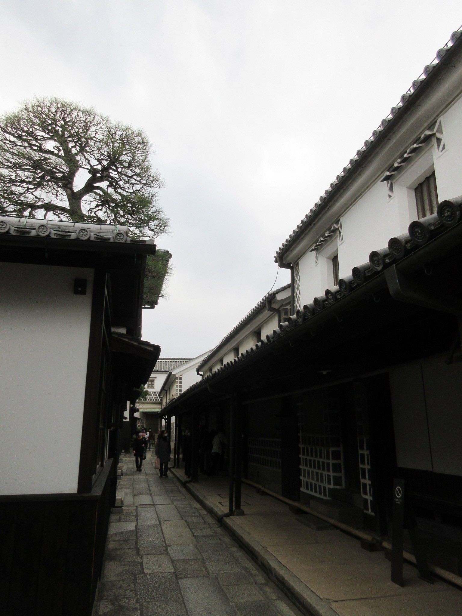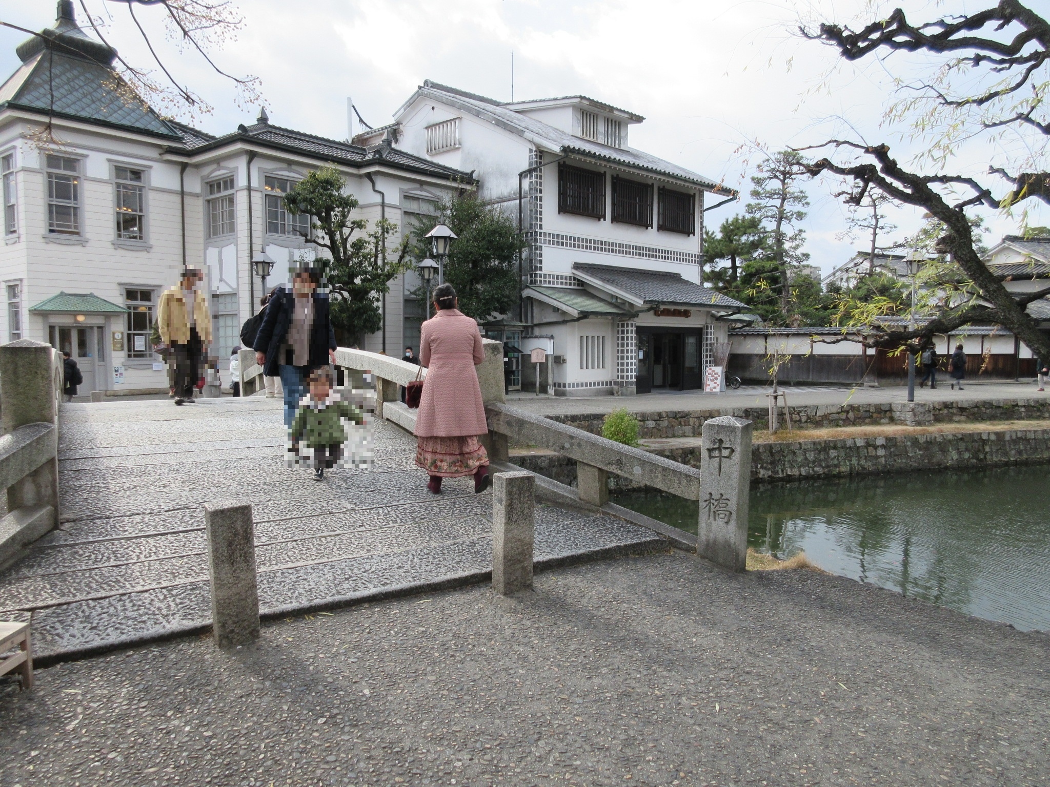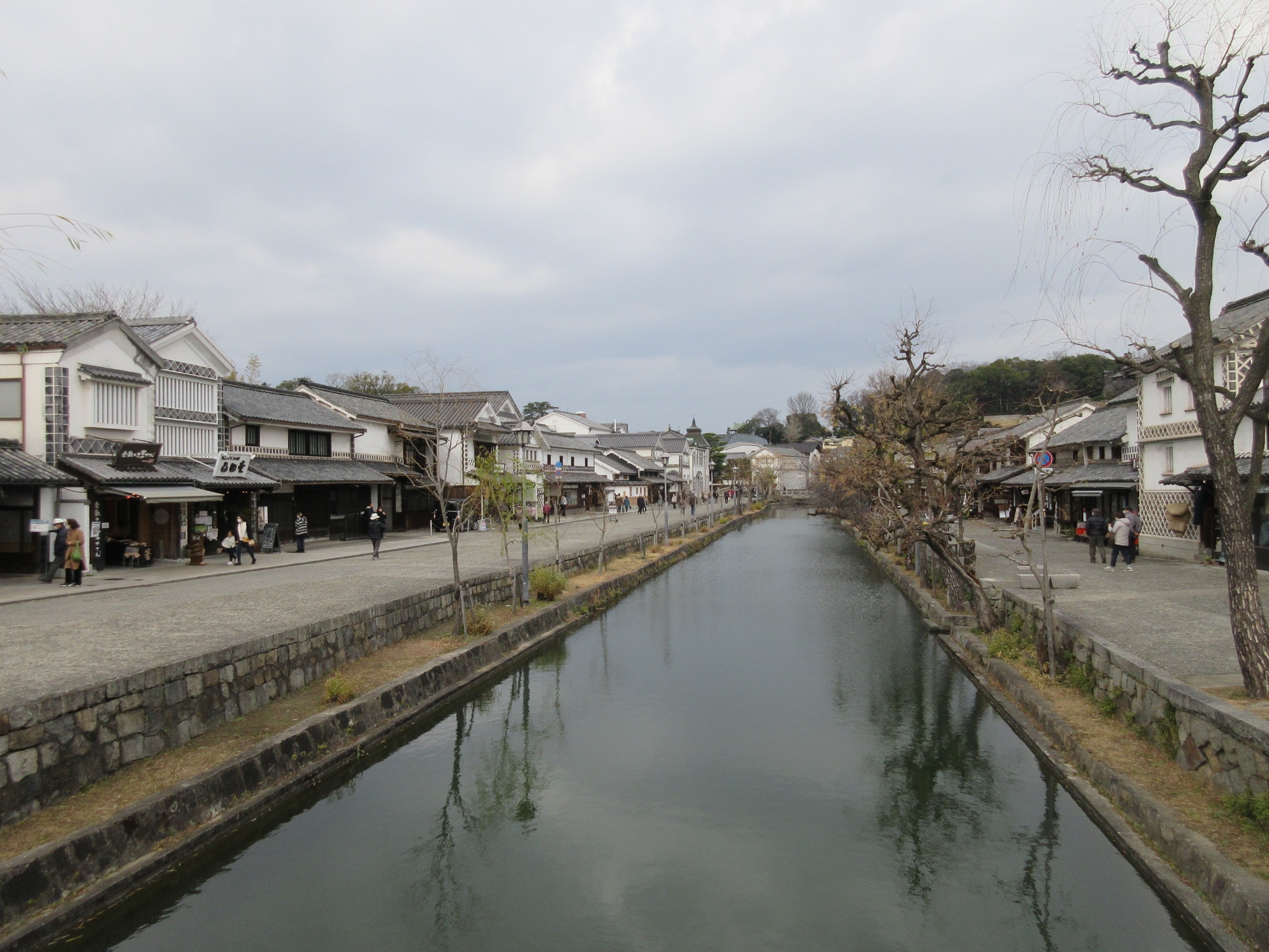 倉敷美観地区を特徴づけているのがこの倉敷川と白壁の歴史的町並みだと思います。美観地区の南端にある高砂橋から北側に目を向けると、柳の木(私が訪問したのが1月なので葉は落ちて木の幹と枝のみですが)を挟んで風情ある街並みが広がっていました。川沿いには所々に休息のための石のベンチがあって、休みながら散策できました。