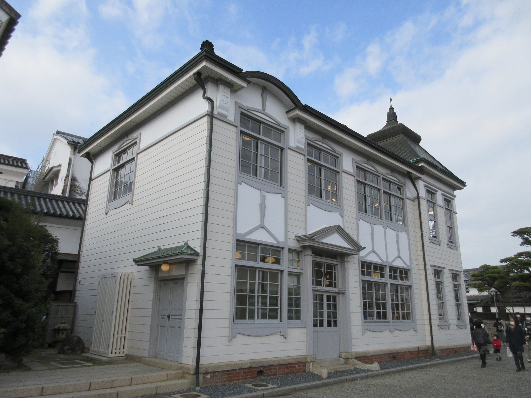 倉敷美観地区の中心、倉敷川の西側中橋のたもとにある大正時代に建てられた洋館で、元は町役場として使われていたそうです。現在は観光案内所として使われており、大正ロマンを感じる外観は記念撮影のスポットにもなっていて、何組ものグループがこの建物をバックにポーズを決めていました。