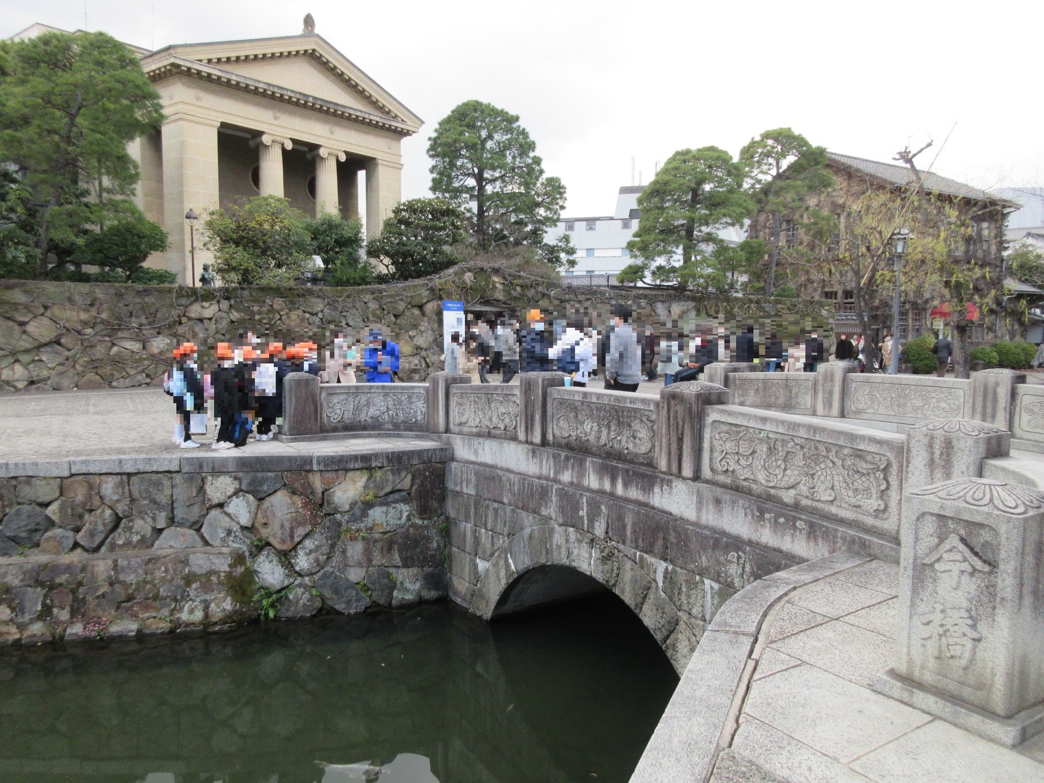 倉敷美観地区の中心を流れる倉敷川を挟んで、東側の【旧大原家住宅】と西側の【大原美術館】を結ぶのがこちらの石橋です。龍の浮彫が施されていて、当時は大陸情緒を感じさせるに十分だったように思います。丁度子供の課外授業があったようで、ガイドさんが橋の歴史について分かりやすく説明をしていることころでした。