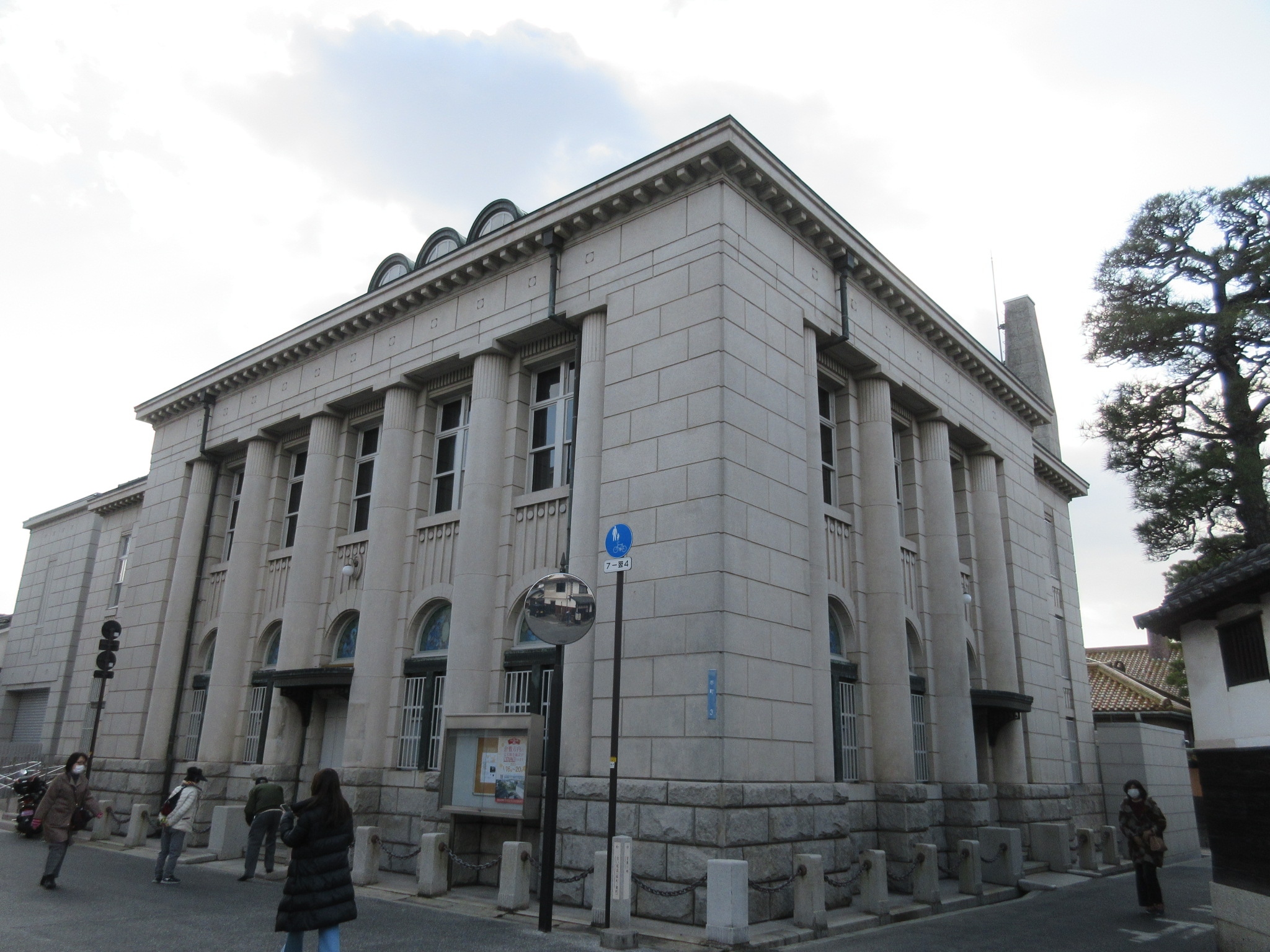 倉敷中央通り商店街の古い白壁の日本家屋が立ち並ぶ一角に、大きな円柱が特徴的な洋風建築がありました。ひときわ目を引くこの建物は、大正の後期に建てられた倉敷を代表する本格的洋風建築の一つで、当時は銀行として使われていたとのこと。倉敷の指定重要文化財に指定されており、今ではすっかり街並みになじんでいました。