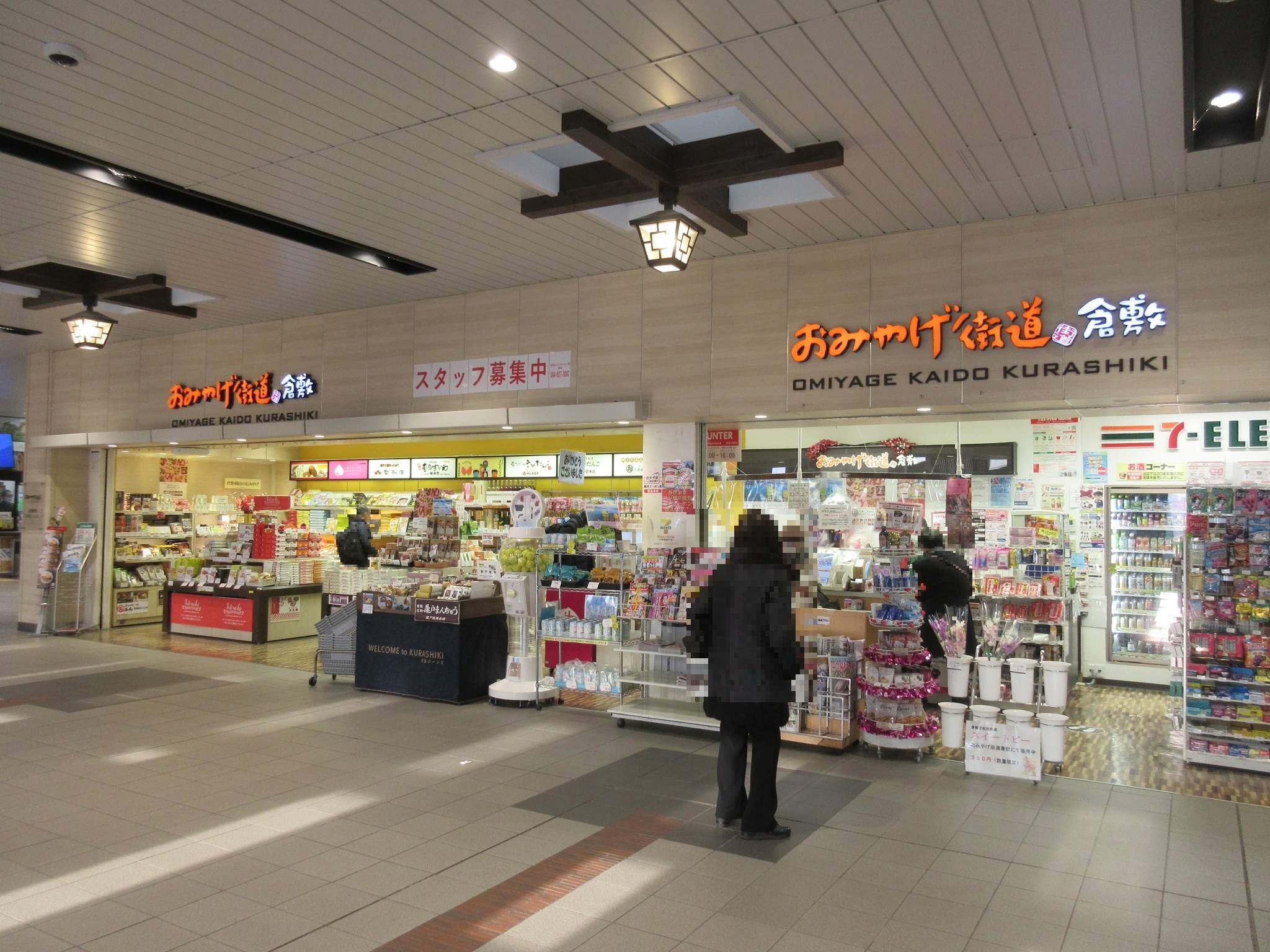 倉敷駅の南北自由通路にあるお土産物やさんで、岡山に戻る電車の発車まで少し時間があったので立ち寄りました。美観地区でいろいろ買い物はしましたが、こちらはコンビニで売っているようなホッカイロや缶コーヒーなどがあって、細切れの時間にコーヒなど買い物ができて助かりました。観光客というより、地元の方が利用しやすいお店だと思いました。