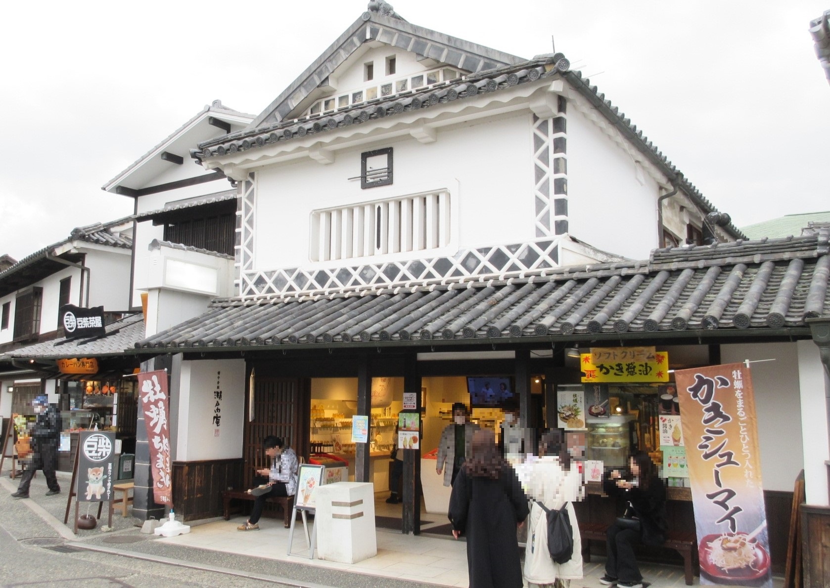 倉敷美観地区の大原美術館見学後に散策した際に訪れた土産物店さんの一つがこちらで、瀬戸内海でとれた海の幸を豊富に使った食品が特徴で、カキを丸ごと一つ使った「かきシューマイ」がとりわけ珍しく、しかも店先で食べられました。歩き疲れていたので、ほっと一息つくことができました。