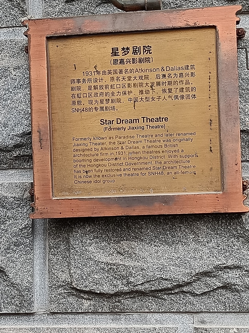 上海が「魔都」と呼ばれていた1931年に建てられた歴史的な建築を利用しており、エントランスのデザインに30年代のモダンで華やかなデザインが残っていました。音楽谷(ミュージックバレイ)とも呼ばれるリノベーションされたスポットからも近く、併せて訪問しました。周りは2階建ての住宅も多い下町の風情があふれており、AKB48の姉妹グループであるSHN48の劇場が本当にこのような場所にあるのか、実は道に迷ったのではないか等と不安な気持ちで歩を進め漸くたどりつきました。