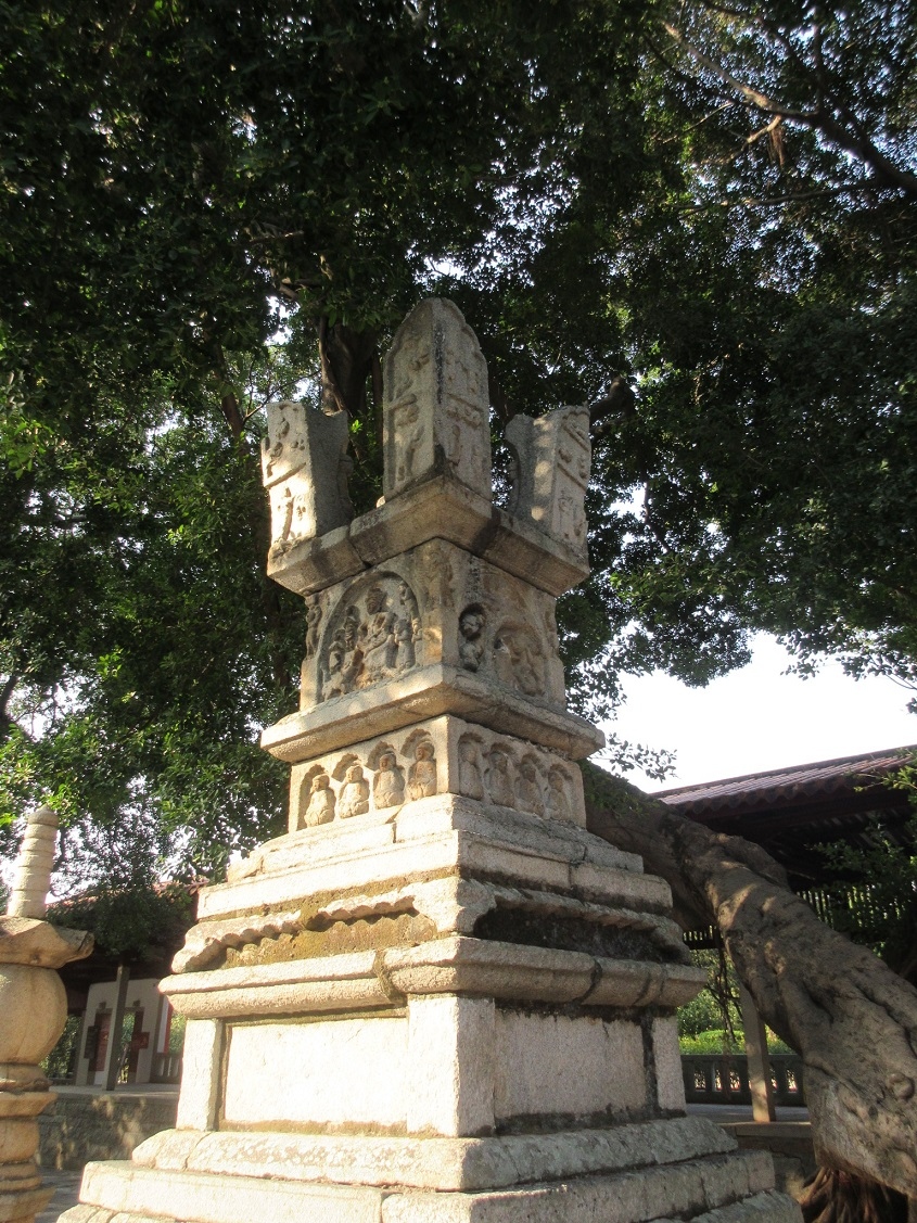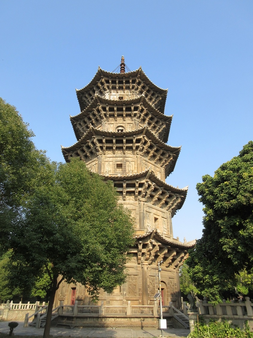 石で作られた高さ40mあまりの二本の古塔がシンボルです。泉州を代表する観光スポットであり、中国の【全国重点文物保護単位】、つまり国宝の一つに指定されています。南宋の時代に建てられた石塔は、木造建築の様式を模しており、肘木な垂木なども木造建築の造形を踏襲していました。壁面の武将や聖人のレリーフも非常に見ごたえがありました。開元寺の周囲に広がる【西街】という古い町並みも見ごたえがありました。
