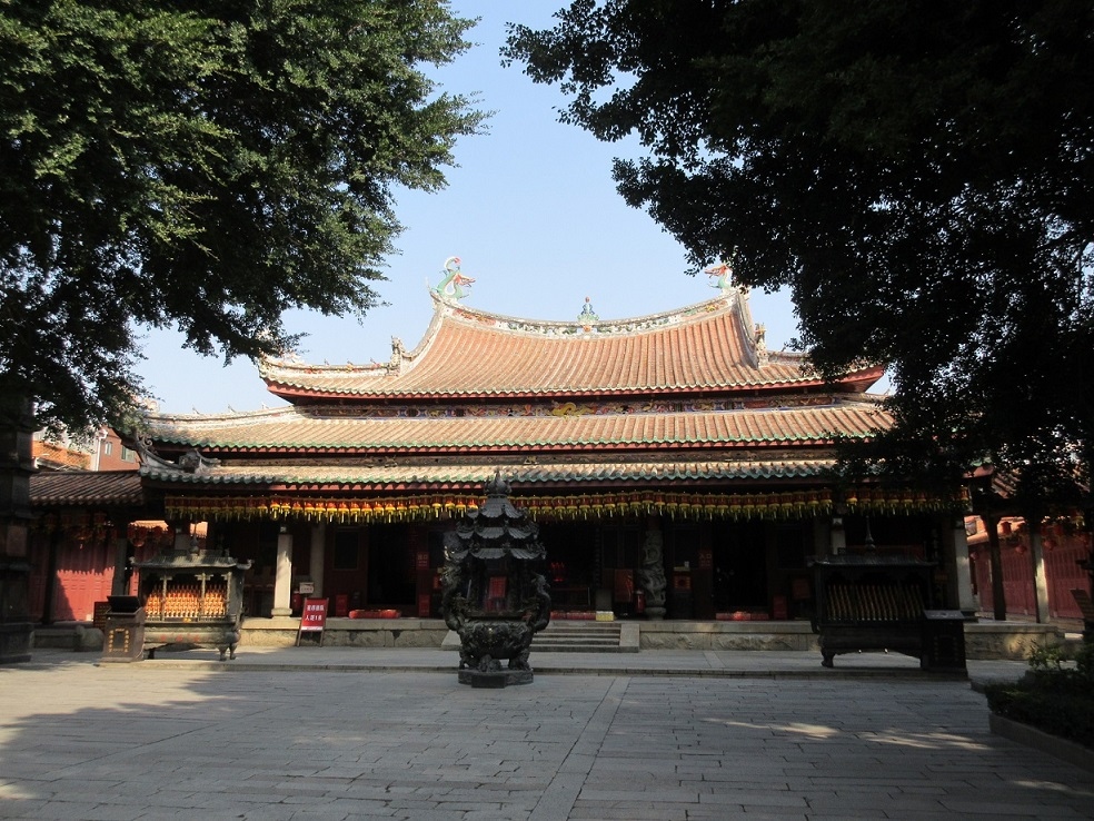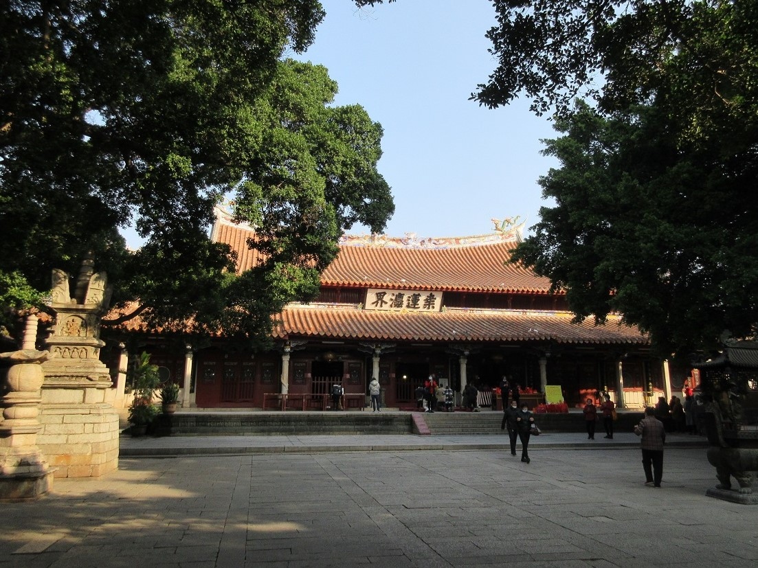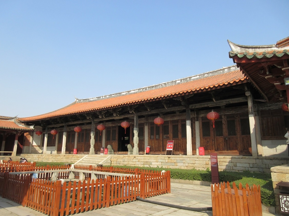 明から清の時代の建物が残る廟で、下町の雰囲気のする細い道路を歩いて漸くたどり着きました。この天后宮のすぐ前には泉州城の南門跡がありましたので、旧市街の守りの要といった役割も果たしていたのかもしれません。境内に入ると、まずは清の時代の屋根のそった本殿のような建物があり目を引きました。その奥にある平屋の横長の建物も、明の時代に築かれたとのことで、シンプルですが存在感がありました。説明文によると、中国に残る「天后宮」の中でも規模の大きな物にあたるそうです。