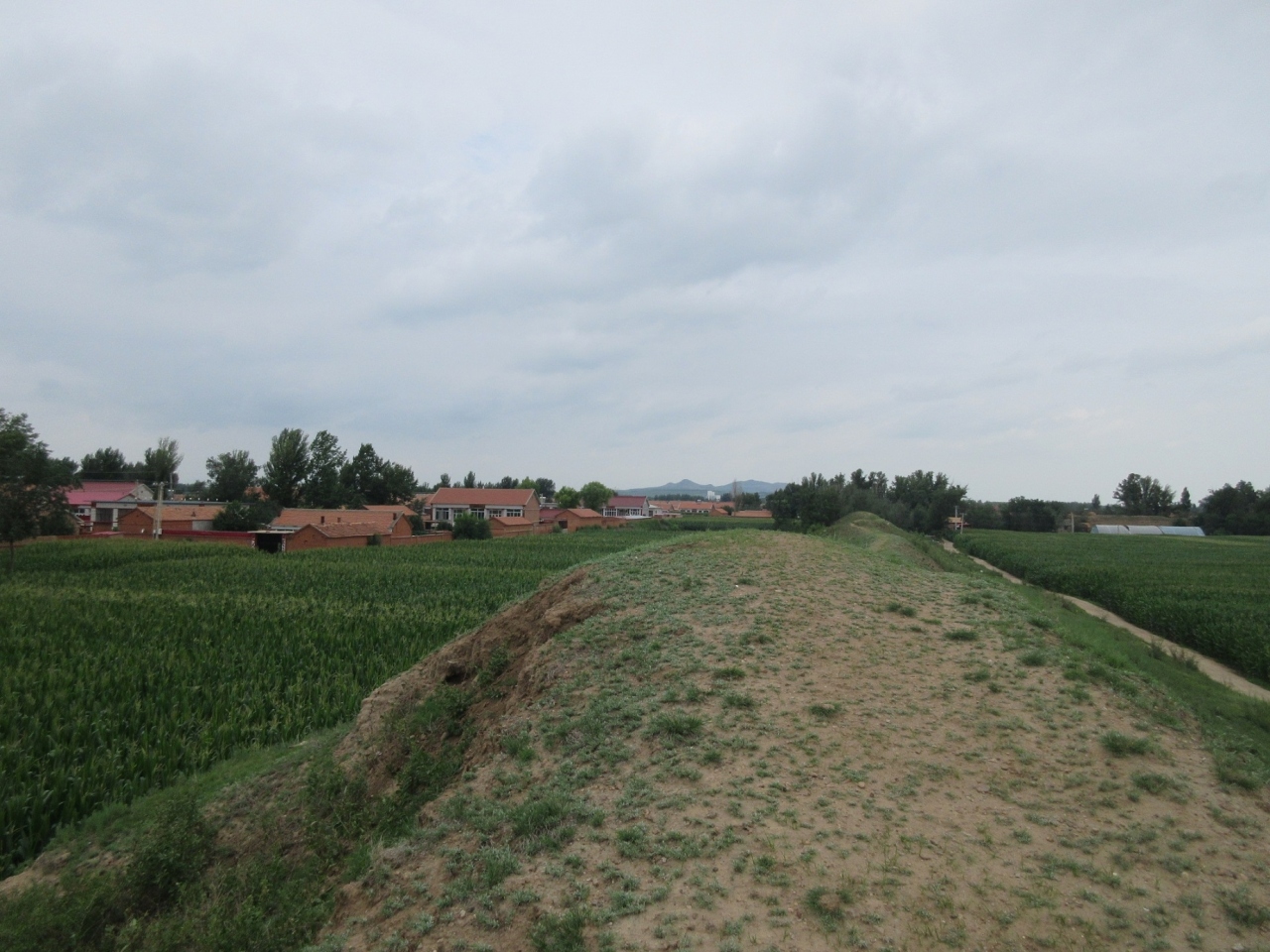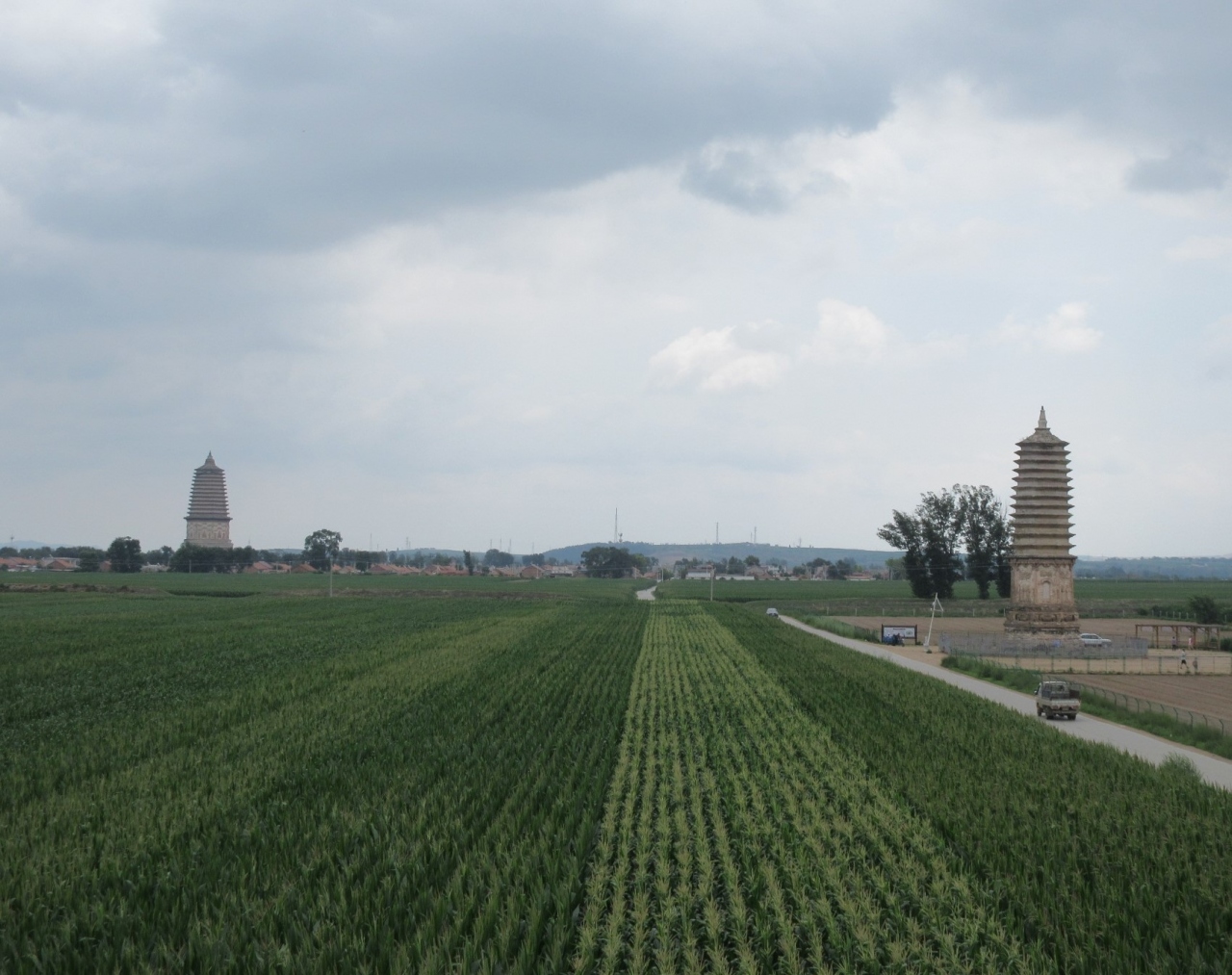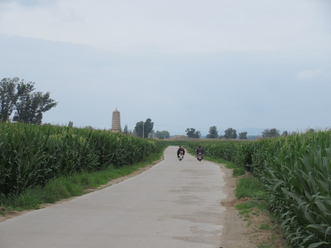 崩れかけた版築の城壁や古塔が、トウモロコシ畑の中に残されています。