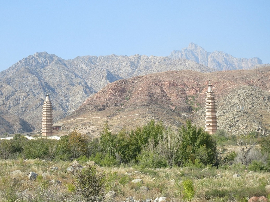 雄大な賀蘭山の山塊を背景に、2本の古塔がそびえていました。