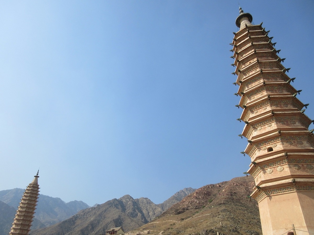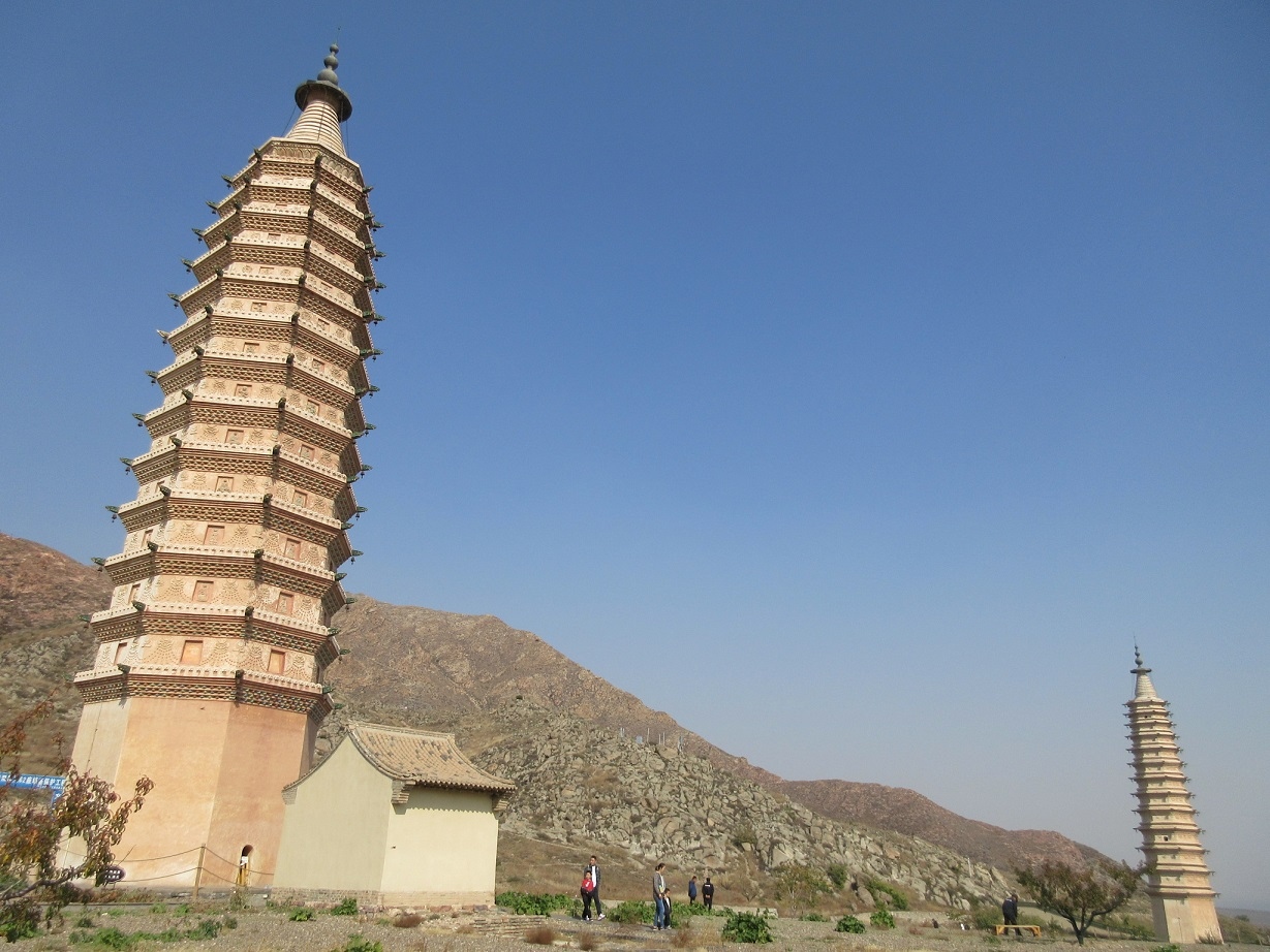 【賀蘭山岩絵】を見学した後、銀川郊外観光の拠点となる【西夏広場】までタクシーをチャーターして向かう途中、ドライバーに頼みこみ乗せて行ってもらいました。雄大な山塊を背景に、2本の古塔がそびえており、車が近づくにつれて1000年の時をさかのぼるような錯覚を覚えました。西夏王国時代に建築された東と西の塔は、それぞれ35mほどの高さありました。どちらも密檐式で建てられており、西塔の壁面には彩色の施された彫刻が刻まれ大変に見ごたえがありました。