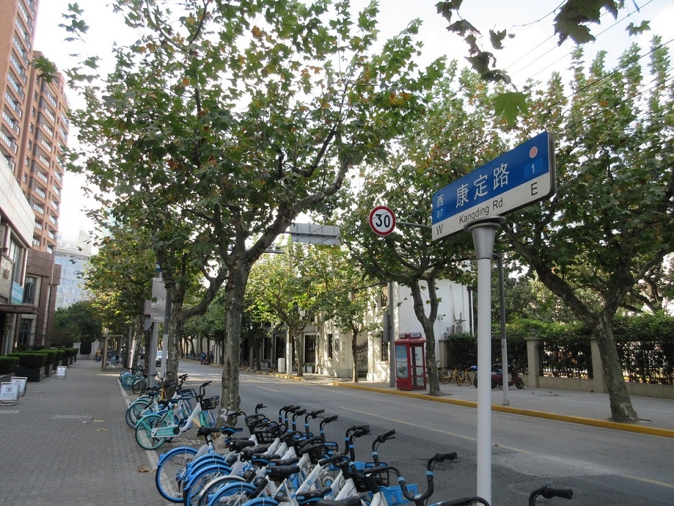 地下鉄1号線と12号線の交わる漢中路駅で下車、蘇州川を渡った先、右手にあるのが「康定路(厳密には康定東路」)です。そこから西に伸びる道ですが、西に進むにつれてマンションが多くなってきました。歴史的な景観を楽しむなら東の蘇州川にそった辺りがお勧めです。張愛玲という上海の女流詩人にゆかりの場所らしく、紹介するボードが設置されていたり、100年ほど前の建築が残っているなど、思いのほか楽しめました。