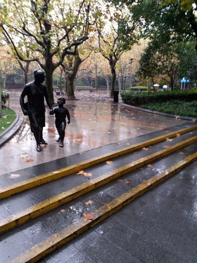 新天地からほど近い淮河公園を訪れました。駅から淮河路まで出て東に進むとすぐに到着しました。この日は生憎と小雨が降りしきる一日で、訪れる人はほぼ皆無。そのため、却って公園内のオブジェなどをゆっくりとみて歩くことが出来ました。母親と手を引かれた子供の像など、分かりやすい内容で楽しめました。