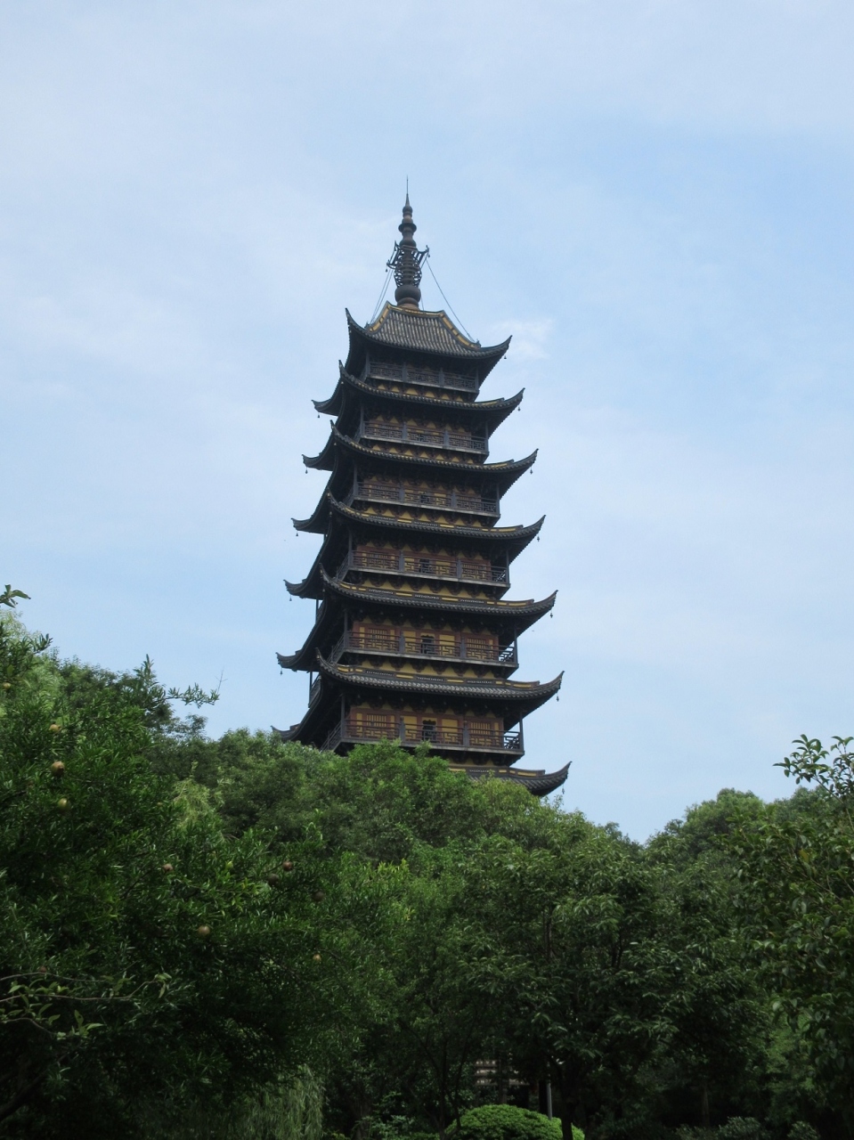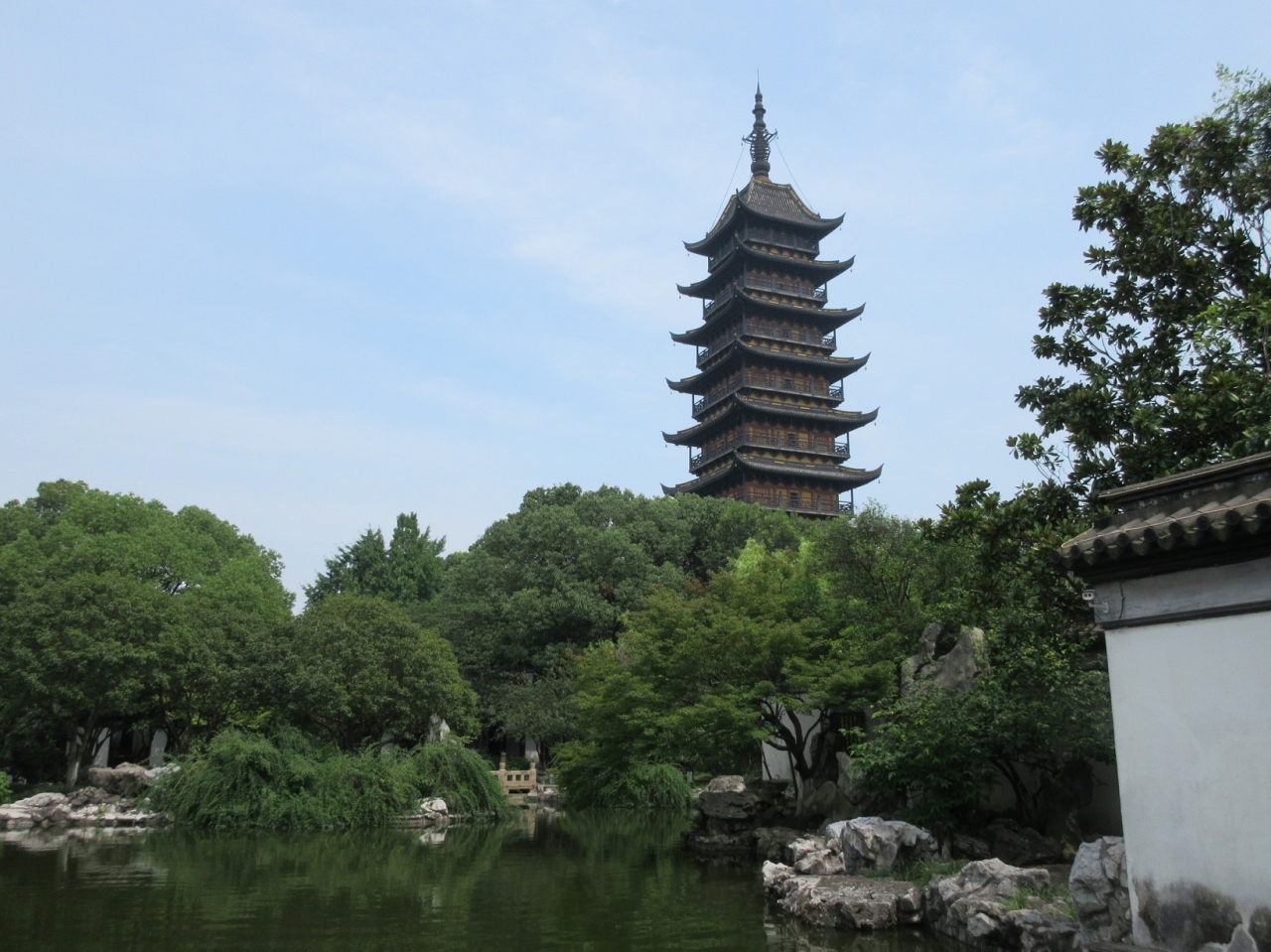 方塔というと上海市松江区にある方塔が有名ですが、この日は蘇州市常熟にある方塔園の方塔を見学に来ています。塔の正式名称は崇教興福寺塔とのことで、宋の時代に建立された後、何度か立て直され現在に至りました。京都の東寺の塔よりも高く67mの高さを誇ります。レンガと木を組み合わせた構造で、周囲にあまり高層建築がないこともあって、威圧する位の存在感を放っていました。【方塔園』は、この塔を中心に池や東屋を配置した江南地方らしい庭園として整備されていて、鮮やかな木々の緑と相まってゆったりとして気持ちで散策出来ました。