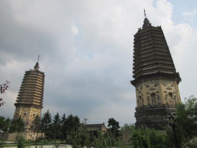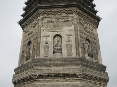 錦州の義県にある奉国寺を見学した後、山越えのバスルートで北鎮へ移動。北鎮バスターミナルから徒歩圏内にある崇興寺双塔を訪れました。崇興寺は堂宇な残っておらず、唯一この東西に並んで建つ双塔が嘗ての遼の時代の雰囲気を伝えていました。南に面した正門の上に些か目障りな電線が走っていて、やむなく塔の北西からカメラに収めました。観光地としてマイナーな存在で、私以外にもう一人が見学していた位で閑散としていました。塔の壁面に施された彫刻は、とても見ごたえがありました。