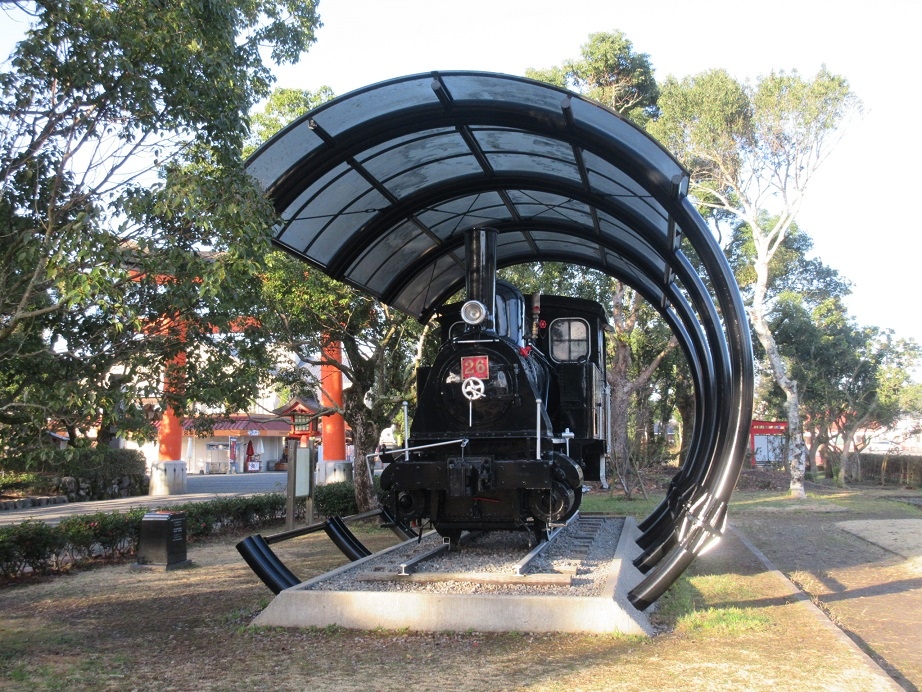 宇佐神宮を訪問した際、門前町を過ぎて最初の鳥居をくぐると、左手に真っ黒い車体の蒸気機関車が展示されていました。1965年まで宇佐参宮線を走っていた蒸気機関車とのことで、可愛らしい姿は愛嬌があるデザインをしていました。九州ではもっとも古い部類に入る貴重な車両とのこと。宇佐神宮の境内に進む前に、貴重な車両を見られて思わぬ収穫でした。