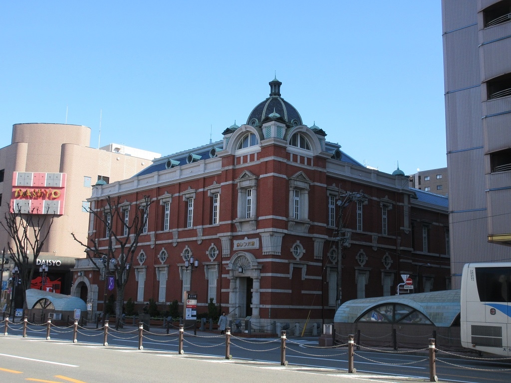 大分駅から北に向かって伸びる大通りを7,8分ほど歩いていくと、トキハ百貨店の横にレンガ造りの見ごたえある西洋風建築が見えて来ました。大分銀行の現役の店舗として使われていて、さらに中にはカフェやショップもあり、仕事としても観光としても利用できる施設でした。1913年に完成した建物は、横からアクセスするとヨーロッパのロマネスク教会の回廊を思わせる風情もあって、見ごたえがありました。
