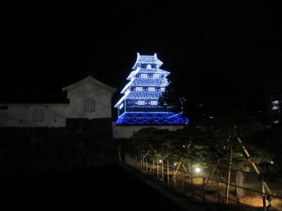 大分城の城跡が整備されて公園になっていました。本丸の天守台跡のすぐ横に、何やら鉄パイプを組んで天守閣のような形の造作物がありました。昼間は何かよく分かりませんでしたが、夜になると青く照らし出され、それが天守閣をイメージした物であることが分かりました。昼と夜では全く異なる雰囲気で楽しめました。