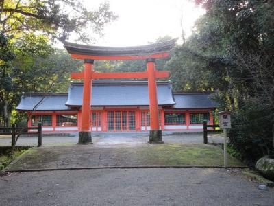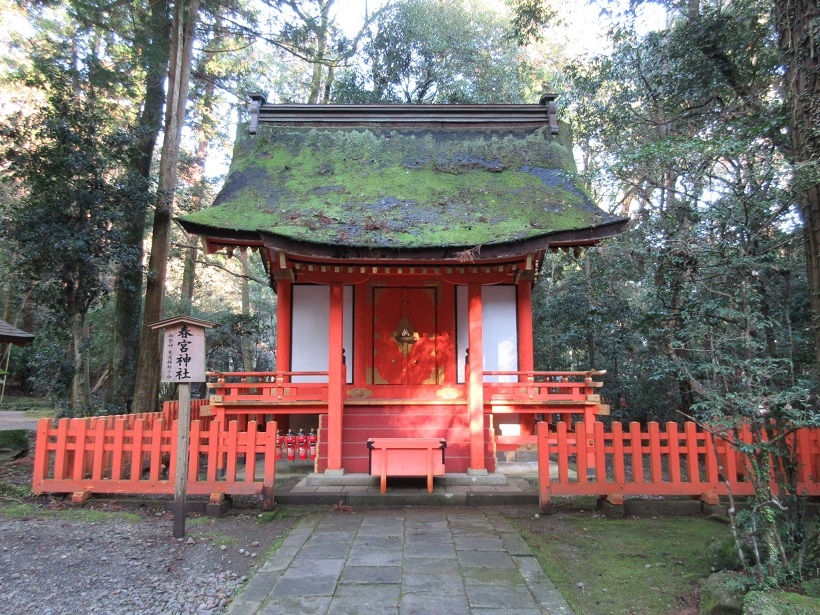 春宮神社と書いて「とうぐうじんじゃ」と読むそうです。宇佐神宮の境内を見学し上宮へと上がる石段の近くにある、こちらのお社も見学しました。、御祭神は第15代応神天皇の皇太子、菟道稚郎子とのこと。周囲は朱色の背の低い柵で囲っていますが、社殿に比べて低いので、圧迫感もなく全景を楽しむことが出来ました。苔むした茅葺屋根が心地よい傾斜角で、優雅な雰囲気を醸し出していました。