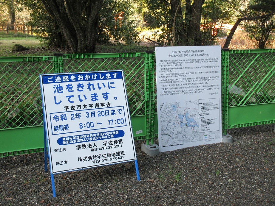 宇佐神宮の境内を散策した際、大鳥居を過ぎて上宮への向かう途中、左手にある池が菱形池です。4トラのコメントを見て興味を持った能舞台をはじめ、私が訪問した時には生憎と工事中で、見学することが出来ませんでした。宇佐神宮の祀る八幡神が降り立ったといわれる大きな池のはずですが、「池の水をきれいにしています」と書かれた看板と仮囲いがされていて、景観を楽しむことは出来ませんでした。