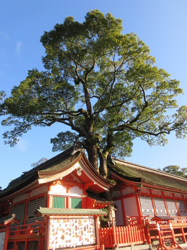 宇佐神宮境内の上宮を訪れると、正面向かって左手にある大きな御神木が八子神社とされていました。神様が宿っているとのことで、周りは柵で覆って保護されていました。朱色の上宮の建物のうまく住み分けているようで、緑の御神木が青空にすっくと伸びた姿は壮観でした。