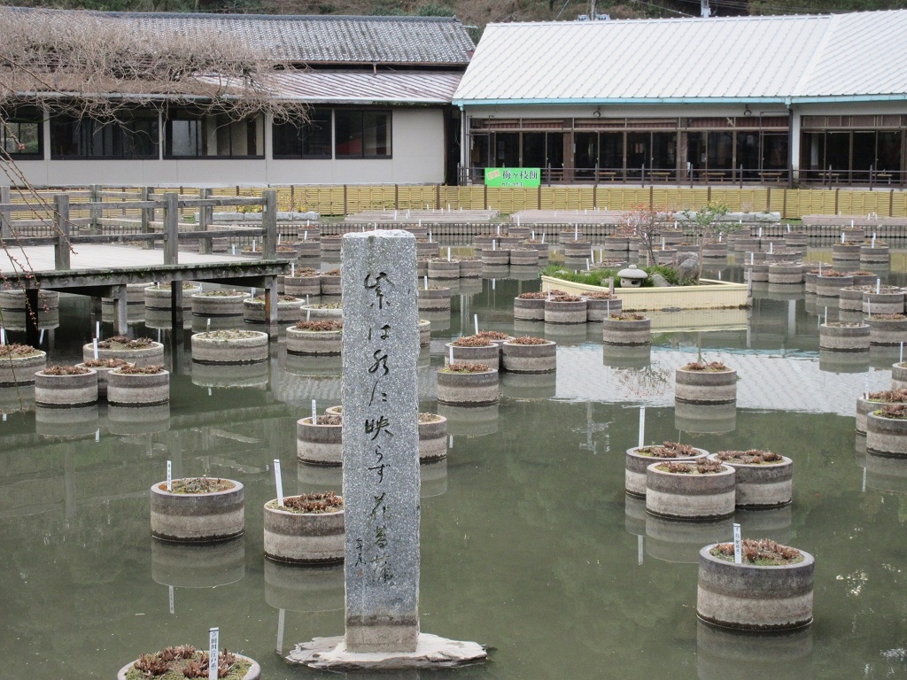 大宰府天満宮の境内散策をした際に、東神苑の菖蒲池の中にこの高浜年尾句碑がありました。菖蒲の季節は3万本の菖蒲が咲き誇るこの池ですが、1月の訪問でしたので菖蒲は見られる、この池の中に建つ碑も場違いのように感じられました。菖蒲の咲き誇る季節に訪れると良いのでしょうが、「紫は水に映らず花菖蒲」との歌も、色彩の乏しい冬の季節では興ざめでした。