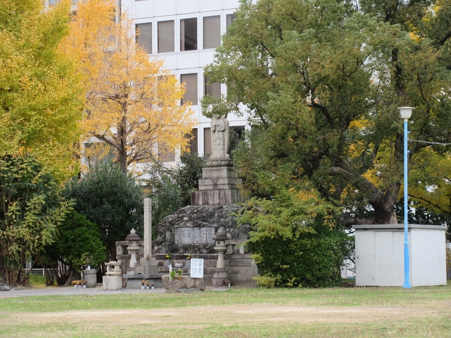 南海電鉄の和歌市駅から和歌山城に向かって目抜き通りを歩いて向かう際、汀公園にある戦災殉難者供養塔にも立ち寄りました。先の大戦末期、ここ和歌山市が空襲により700人以上の方が犠牲になったことから、彼らの慰霊のために建てられた物とのこと。碑文には惨劇を伝えるとともに、平和へ願う思の願いが刻まれていました。
