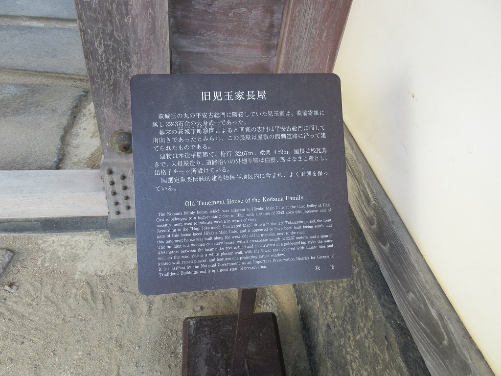 萩の城下町を訪れ、堀内地区を散策した際に立ち寄った観光スポットの一つがこちらです。公衆トイレも近くに設置されていて、トイレ休憩を兼ねての訪問でした。この長屋門は白い漆喰の壁になまこ壁という、贅沢な雰囲気のする外観で、この界隈の長屋門の中でも群を群を抜いて見ごたえがありました。