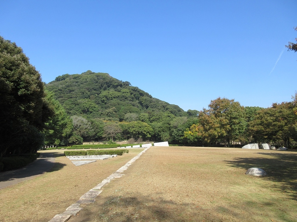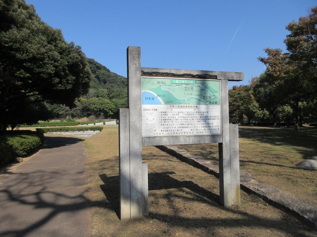 萩市の観光のちゅうしんである萩城から西に行った先にあり、私が訪問した際にはほとんど人影も見えず、芝生の緑が目に鮮やかな広大な公園が広がっているだけでした。現代美術のモニュメントのような物が多数あり、それが故に石彫公園と呼ばれているようです。