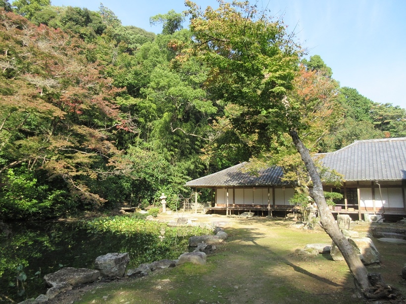 毛利家藩主の墓所があることで知られる大照院ですが、本堂の左手にそって奥に入ると、池を中心に据えた庭園が広がっていました。こちらは有料エリアで、紅葉の季節は山の紅葉した様が美しいかもしれませんが、私が訪れたのはまだ温かい11月初旬とあって、木々は色づいておらず、さほどインパクトは感じられませんでした。