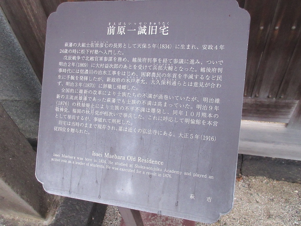 萩で宿泊したホテルからほど近いに場所にありました。前原一誠は戊辰戦争にも参加した松下村塾の門下生ですが、明治維新後は、反新政府の萩の乱をおこして刑死した人物です。彼の旧宅は、大通りから住宅地の中に細い路地を入っていった先にあり、少し分かりにくかったですね。中は見学できず、門のみ見学することが出来ました。説明版がなければ通り過ぎてしまいそうな、質素な佇まいでした。