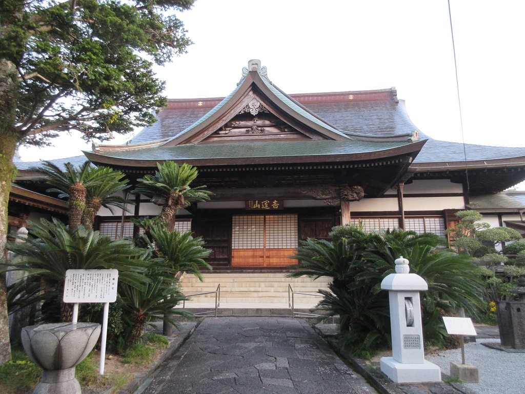東萩駅から萩城に向かう大通りに面したお寺の一つがこちらで、櫓のような大きな山門がひときわ目を引きました。銅葺きの本堂も均整のとれた建築で見ごたえがありました。本堂の前には、比較的新しい仏足石が置かれていましたし、なにかと見所の多いお寺でした。