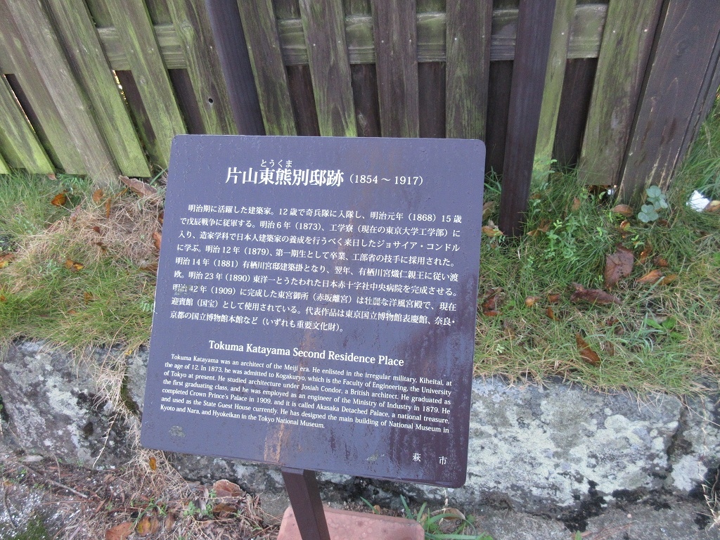 赤坂の迎賓館で有名な建築家として知られる片山東熊ですが、若い頃には奇兵隊の一員として戊辰戦争に従軍した幕末の志士でした。私も建築家としての一面のみしか知らなったのですが、松陰神社から東光寺に向かう道すがら、彼の別邸があったことを示す案内板を目にしました。今は普通の民家が建つのみの場所に設けられたこの案内板を読み、初めて青年期の片山東熊に触れたようで、感慨を深く致しました。