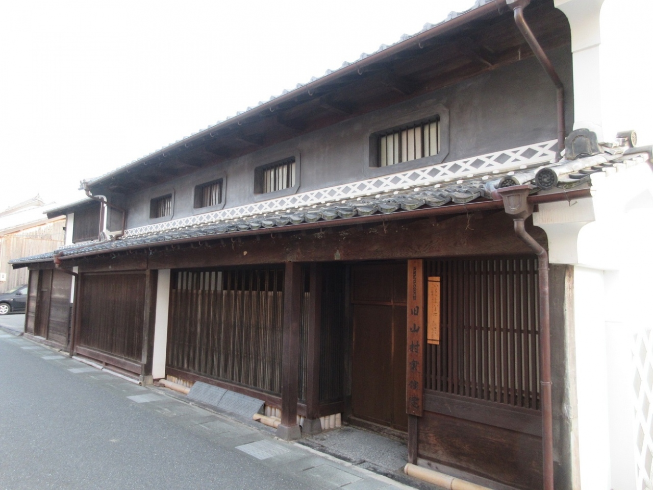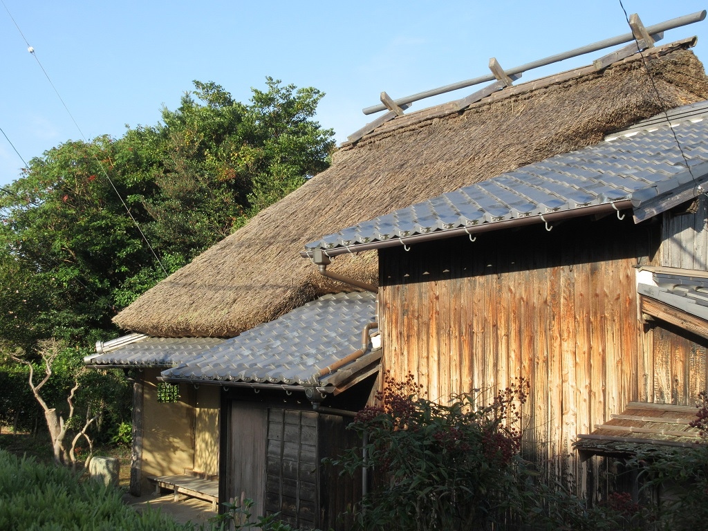 萩の観光をした際、【重要伝統的建造物群保存地区】の一つである浜崎地区を散策した際に目に入った町屋建築の一つがこちらです。正面から見ると間口が狭いのですが、意外と奥行きがあり、地域を代表する商家の一つであったことを伺いしることができました。正面に向かって右側は、おそらく隣家が取り壊されたのでしょう、外壁は窓もなく一面に板を貼って風雨から保護されていました。