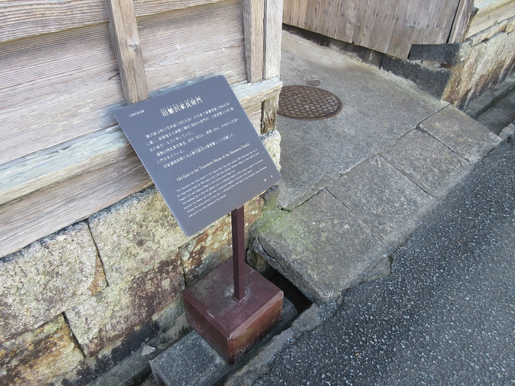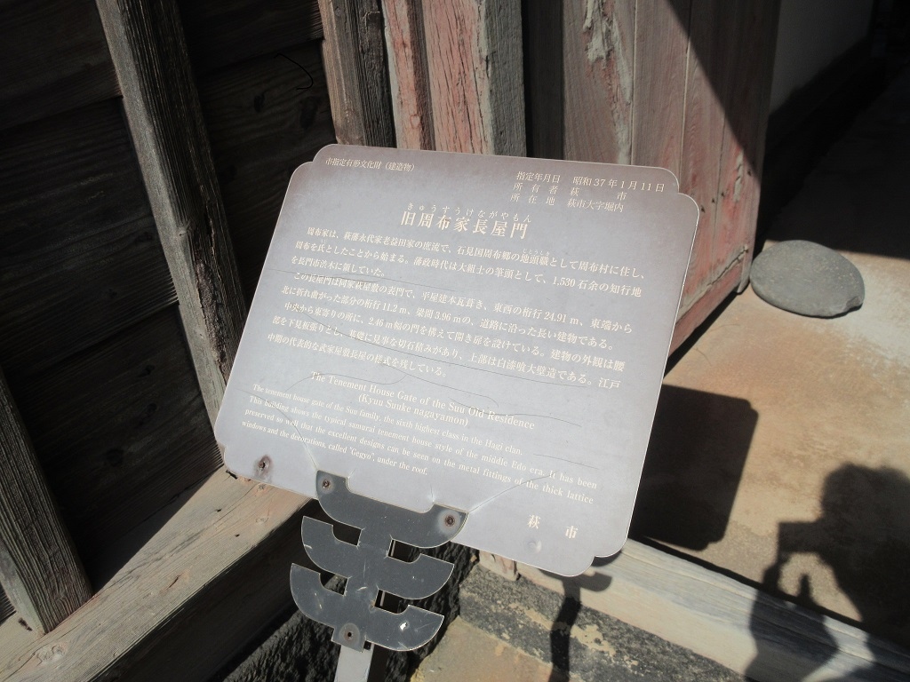平安古の古い町並みを楽しみながら、鍵曲交流館のすぐ手前にあるこちらのスポットに到着しました。立派な門構えから、すぐに武衛屋敷と分かりました。萩藩の坪井九衛門の旧宅の跡で、今でも住宅をして使われていることから外観のみの見学となりました。長屋門は、屋根の樋なども瓦と同じような灰色、郵便ポストも古びて灰色がかった木製の物でしたし、景観に配慮しつつ維持管理していることが伺えました。