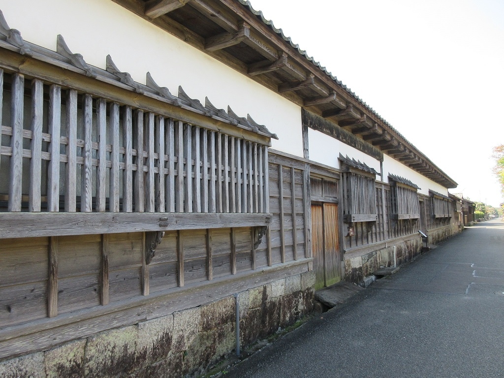 萩の城下町を訪れ、【北の総門】から萩城に向かってメイン通りを歩いていくと、旧益田家物見矢倉の向かい側、つまり道の南側にある旧繁沢家長屋門を外観だけですが見学することが出来ました。貼りだした格子窓が並ぶさまは壮観で、長屋の長さは35mもあるとのことで、とても見ごたえがありました。