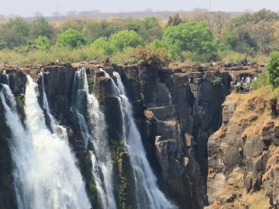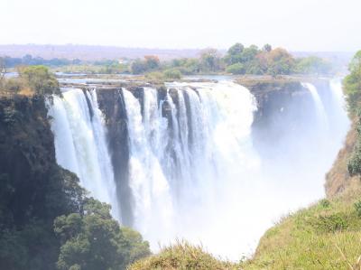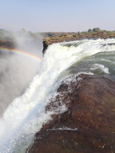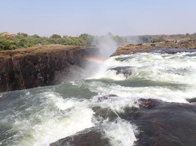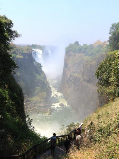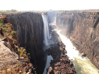 滝下の峡谷の先は、渇水期でも水煙で奥が見えない。ビクトリア滝は峡谷の片...