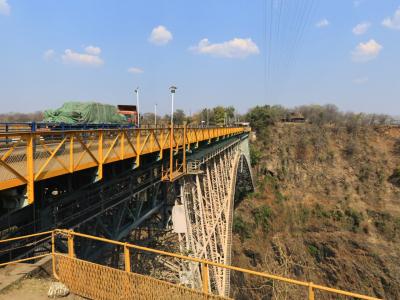 右岸下流側から見たビクトリアフォールズ橋。橋の中間部にバンジージャンプ...