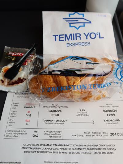 往路も復路もタシケント~サマルカンド間で軽食と飲み物のサービスがありました。