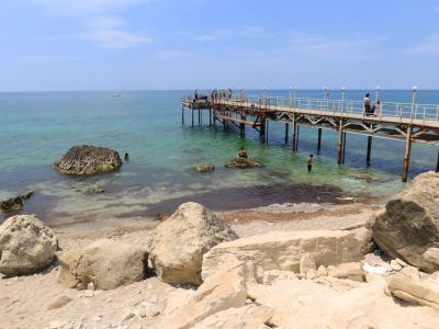 遊歩道の先は岩場から干潟のような場所もあり、やがて「I LOVE AKTAU」のモニュメントのある岬に至ります。