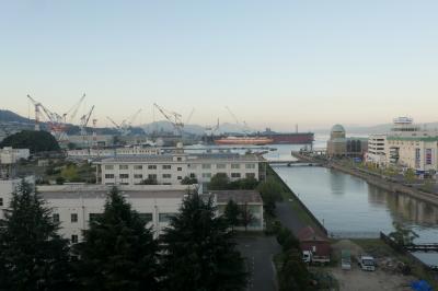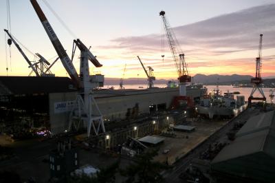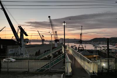 呉港沖の江田島の山に沈む夕陽、夕焼け空にクレーンのシルエットなど、天気が良ければ絵になる夕景を見ることができると思います。- 旅行時期