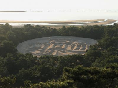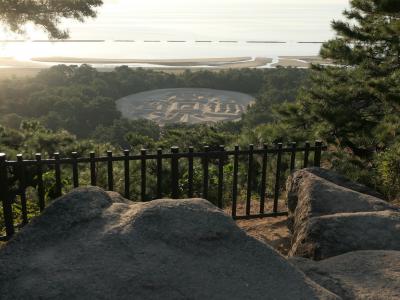 「寛永通宝」の銭形砂絵を見下ろす標高約59mの銭形展望台までは、麓から1kmもない道のりなので徒歩でも問題なく上れます。