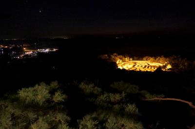 なお、銭形砂絵のライトアップは毎日、日没から午後10時まで見ることができ、通常はグリーンで、期間限定でゴールドやブルーにライトアップされることがあるようです。- 旅行時期