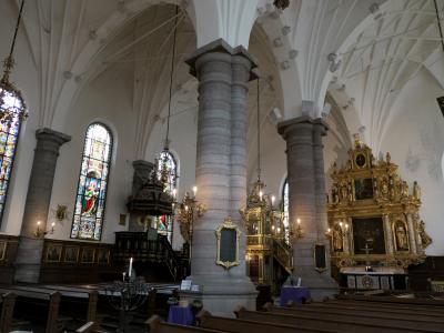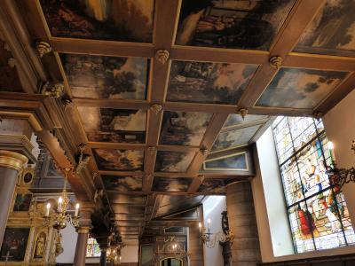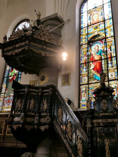 ガイドブックには、38の金メッキの天使の顔(注目してなかったので気付かなかった)や黒壇とアラバスター(雪花石膏)製の説教台が記載されているようですが、個人的には絵画が多いことと独特のステンドグラスが面白いと思いました。