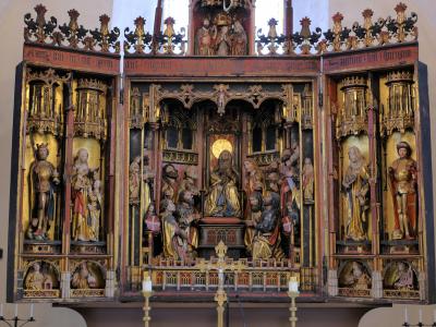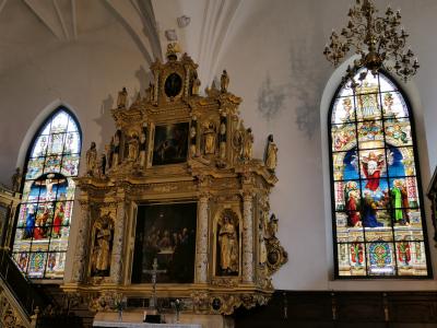 - 主祭壇の木彫りの彫刻と新旧聖書の物語を描いた「貧者の聖書」