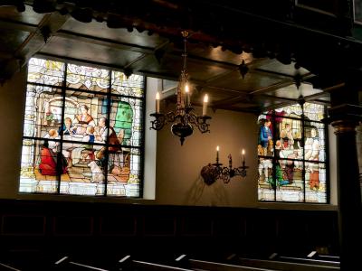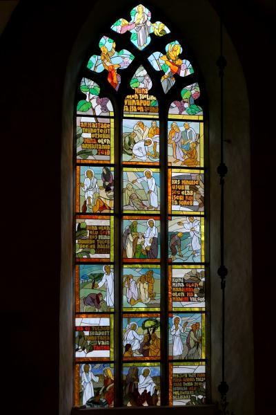 他ではあまり見ない、家庭の風景を描いたステンドグラスも見られます。