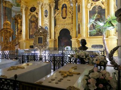 主祭壇の両側には、ピョートル大帝など歴代の皇帝の棺が並んでいて、聖堂入口の右側にある聖エカテリーナの礼拝堂には、帝政ロシア最後の皇帝ニコライ2世と家族、召使いたちが葬られています。