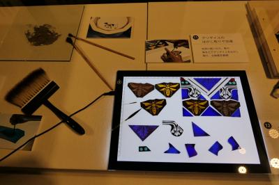 本来教会などの建物で見られるステンドグラスは、外壁に設置され自然光で絵画のように浮き上がるものですが、ここで展示されている作品のほとんどは裏から照明を当てているものと思われます。
