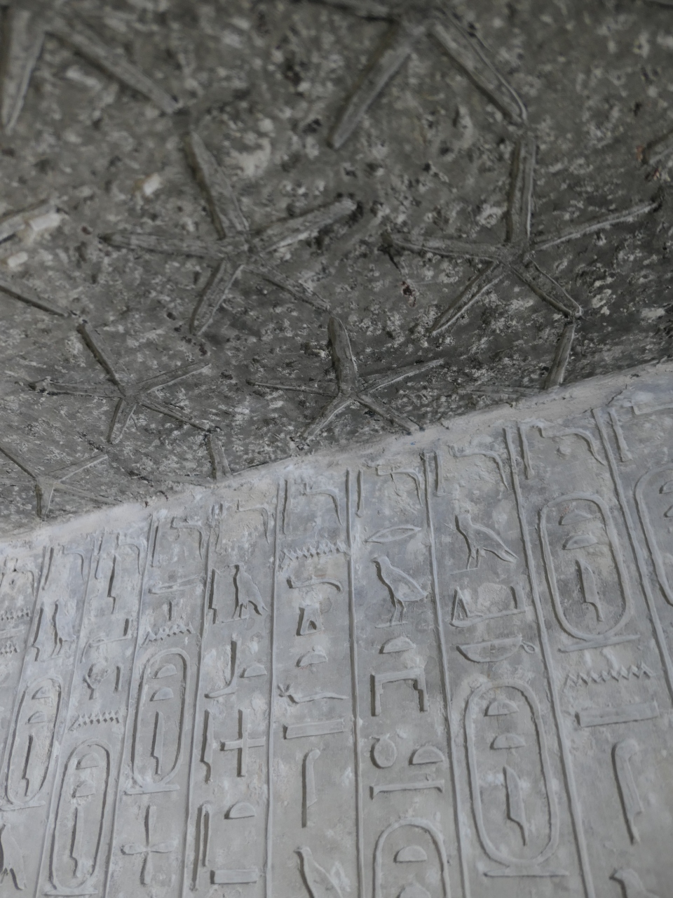 それほど長くない斜路を下りて狭い通路を抜けると、一面にピラミッドテキスト(ヒエログリフで刻み込まれた文書)で埋め尽くされた壁の部屋があります。
