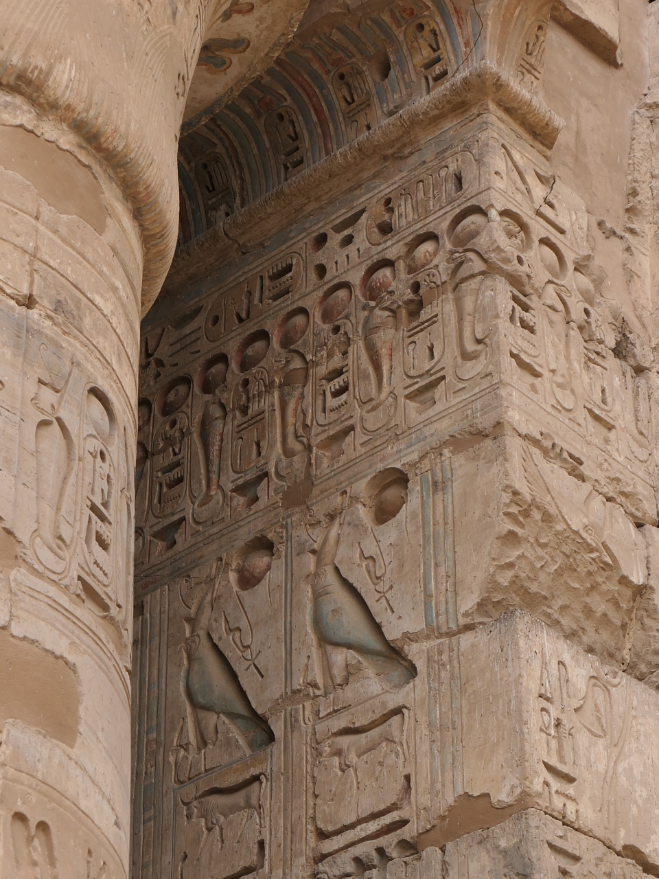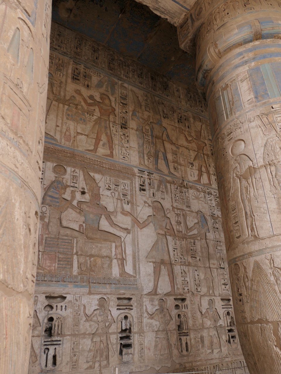 壁には当時の人々の暮らしぶりが描かれた精密なレリーフが見られ、部分的に色が残るところもあります。